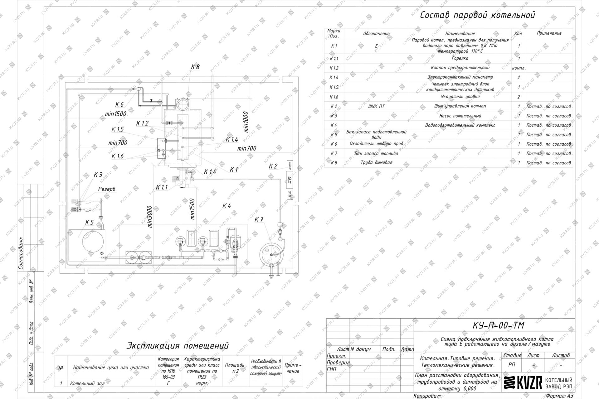Предназначен для получения насыщенного пара низкого давления 1000 кг пара в час - температурой не более 170 °С и давлением не более 0.9 МПа, 0.9 кгс/cм² или 0,9 бар. Применяют паровые котлы 1,0 т пара в час на дизеле строительные организации, бетонные заводы, ЖБИ, воинские части, мясокомбинаты, консервные заводы, автоколонны, ДСУ, хлебозаводы, мелькомбинаты, маслосырзаводы, птицефабрики, свинокомплексы, предприятия нефтегазовой промышленности и сельского хозяйства в животноводстве, птицеводстве.
