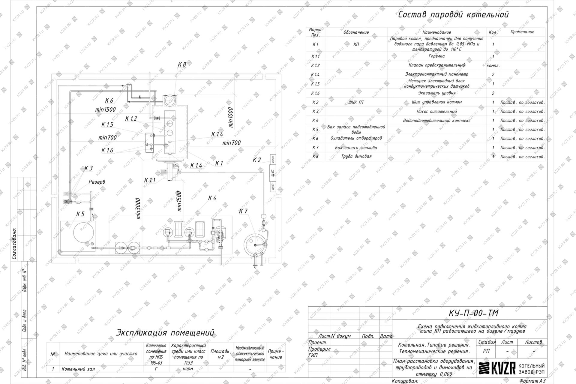 Чтобы правильно подключить дизельный паровой котел 500 кг / 0.5 т пара -115 °С -0,07 МПа / 0,7 кгс/cм² в котельной необходимо оставить проемы для обслуживания оборудования во время эксплуатации. На представленной здесь схеме обозначены их размеры. Кроме того, в данной примерной схеме монтажа паровых котлов и оборудования указан перечень минимально необходимого вспомогательного оборудования.