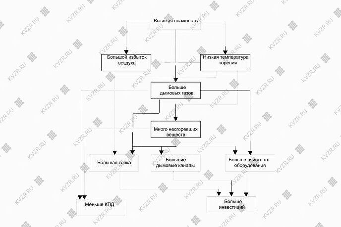 Влажность топлива определяется процентным содержанием влаги, топливо с влажностью меньше 30% считается сухим. При этом верхняя допустимая граница влажности варьируется от 50 до 55%. При большем проценте влажности практически невозможно достичь эффективного режима горения и образования тепловой энергии.