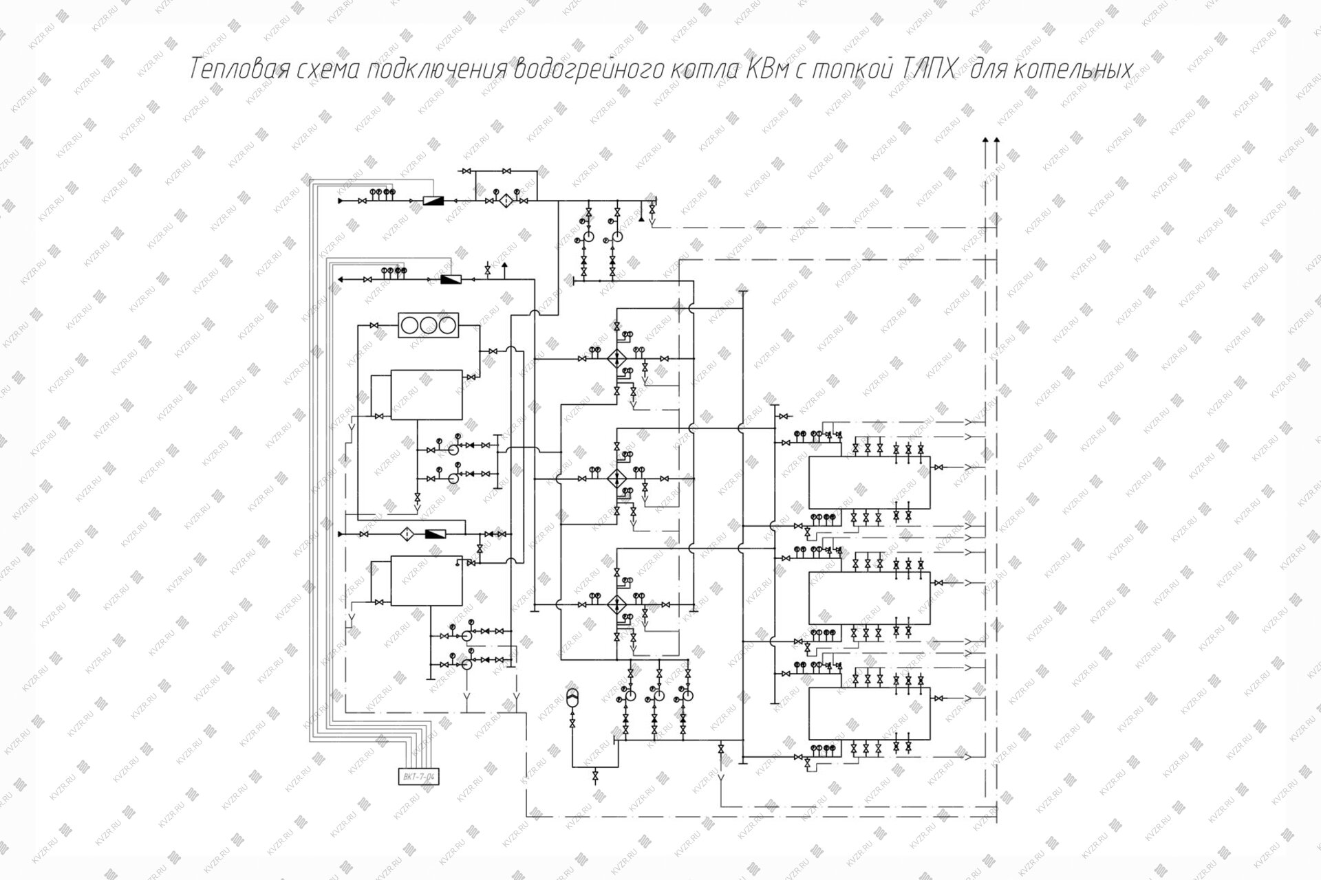 К вспомогательному оборудованию при подключении промышленного водогрейного котла КВм с ТЛПХ относят - щит управления котлом, насос циркуляционный, насос подпиточной воды, бак запаса воды, расширительный мембранный бак, транспортеры, дымовую трубу, систему газоходов и дымосос, золоуловитель (по желанию).