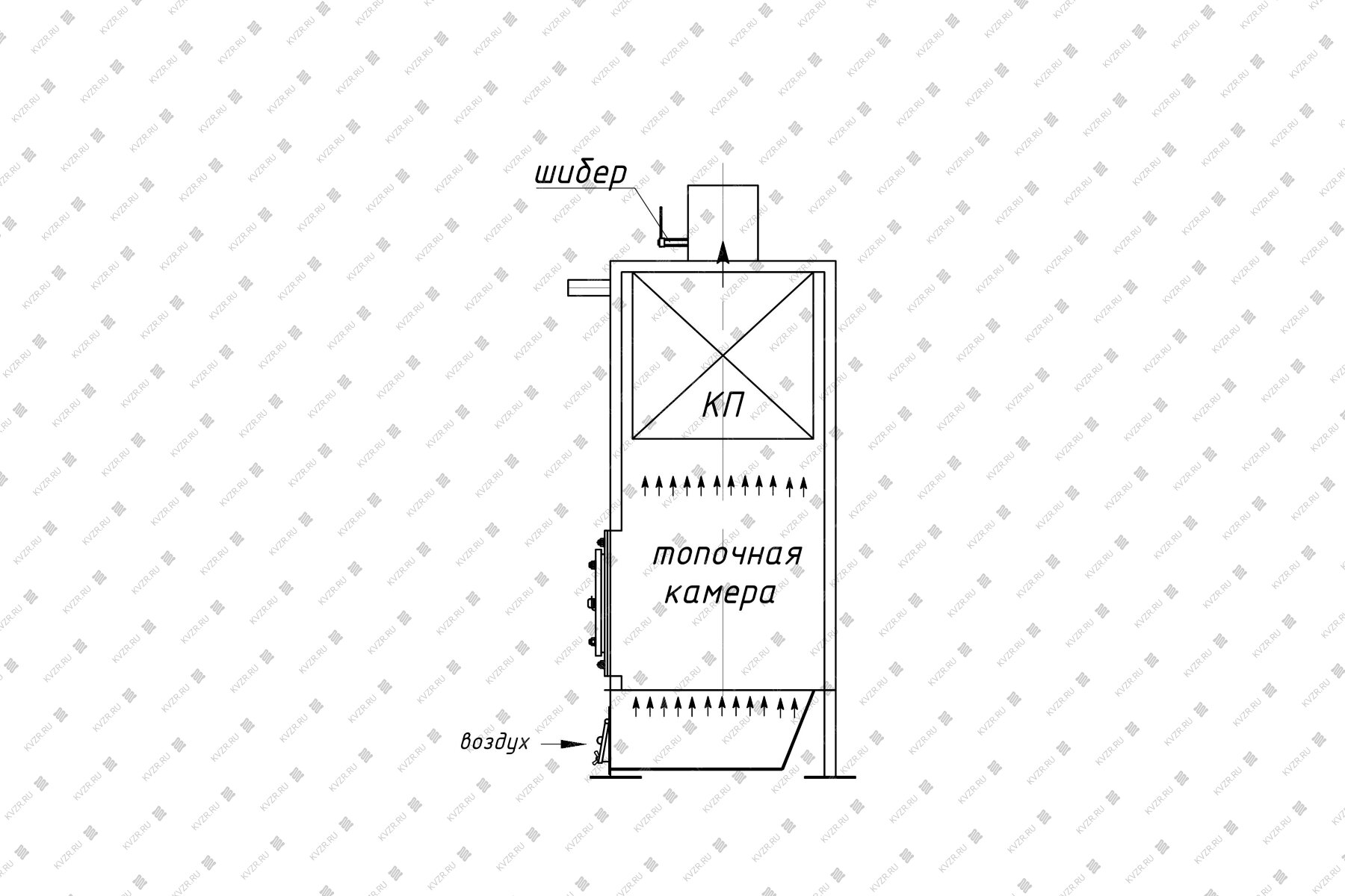 Подвод воздуха в водогрейный котел КВр 0.25 МВт осуществляется за счет разряжения в топке, путем подсоса через дверку - заслонку в зольный короб под колосниковую решетку.