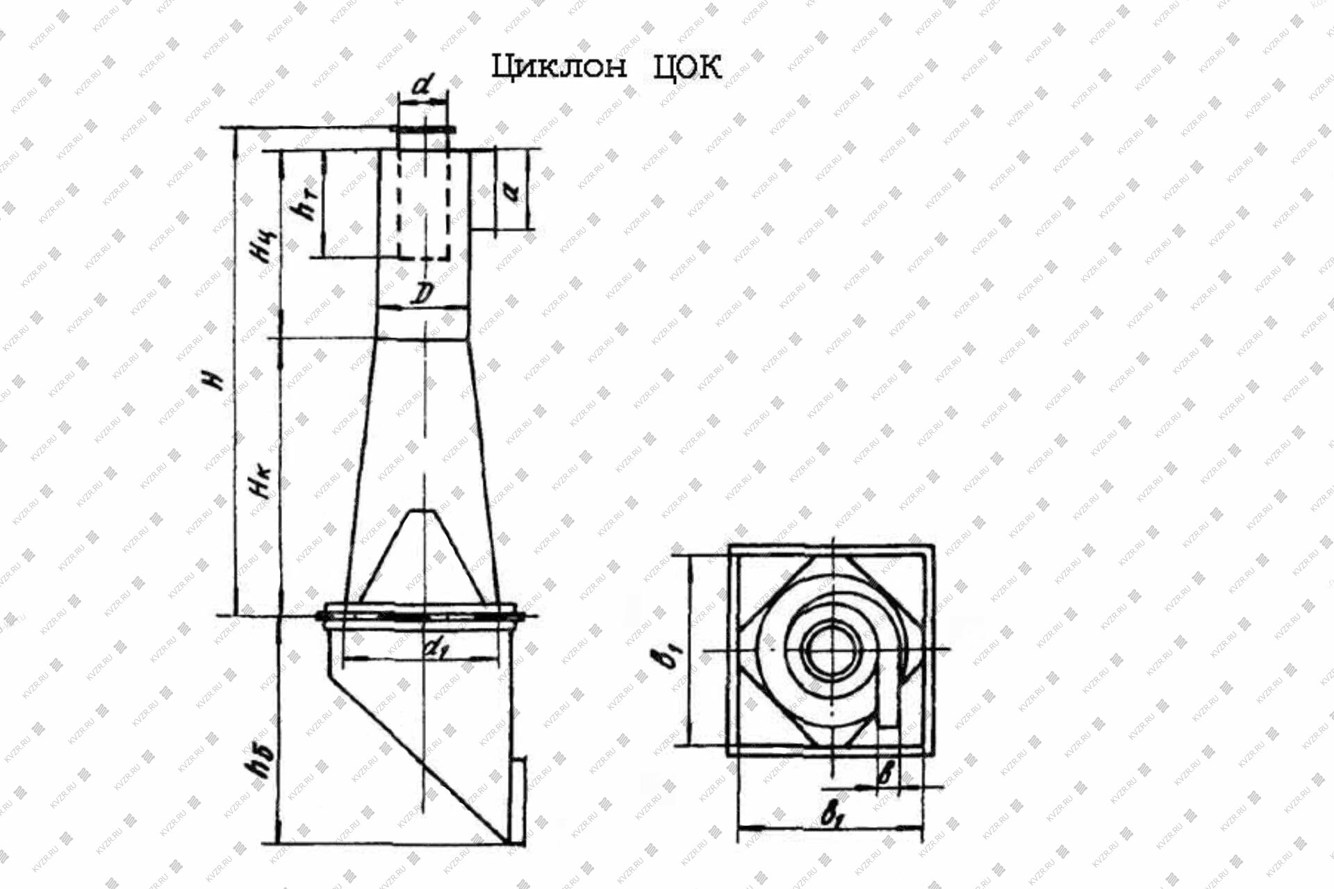 Циклон пылеуловитель ЦОК 5 с обратным конусом состоит из корпуса с входным патрубком, внутреннего конуса, выхлопной трубы и пылесборника. Пылесборник может быть в виде бункера или выдвижного ящика. Короткая часть цилиндрического корпуса переходит в расширяющийся книзу конус, непосредственно присоединяющийся к пылеприемному бункеру. При установке агрегата на кронштейне бункер имеет коническую форму, а к пылевыпускному отверстию может подсоединятся затвор типа «мигалки» или шиберный затвор. Рекомендуется установка на кронштейне аппарата диаметром не более 300 мм. Для повышения эффективности пылеосаждения и предохранения осевшей пыли от взмучивания и уноса из бункера в нижней части агрегата устанавливается внутренний конус. Угол при основании внутреннего конуса зависит от рода и характера осаждаемой пыли: для сухой пыли — 45°, для сажи и талька — 60°.