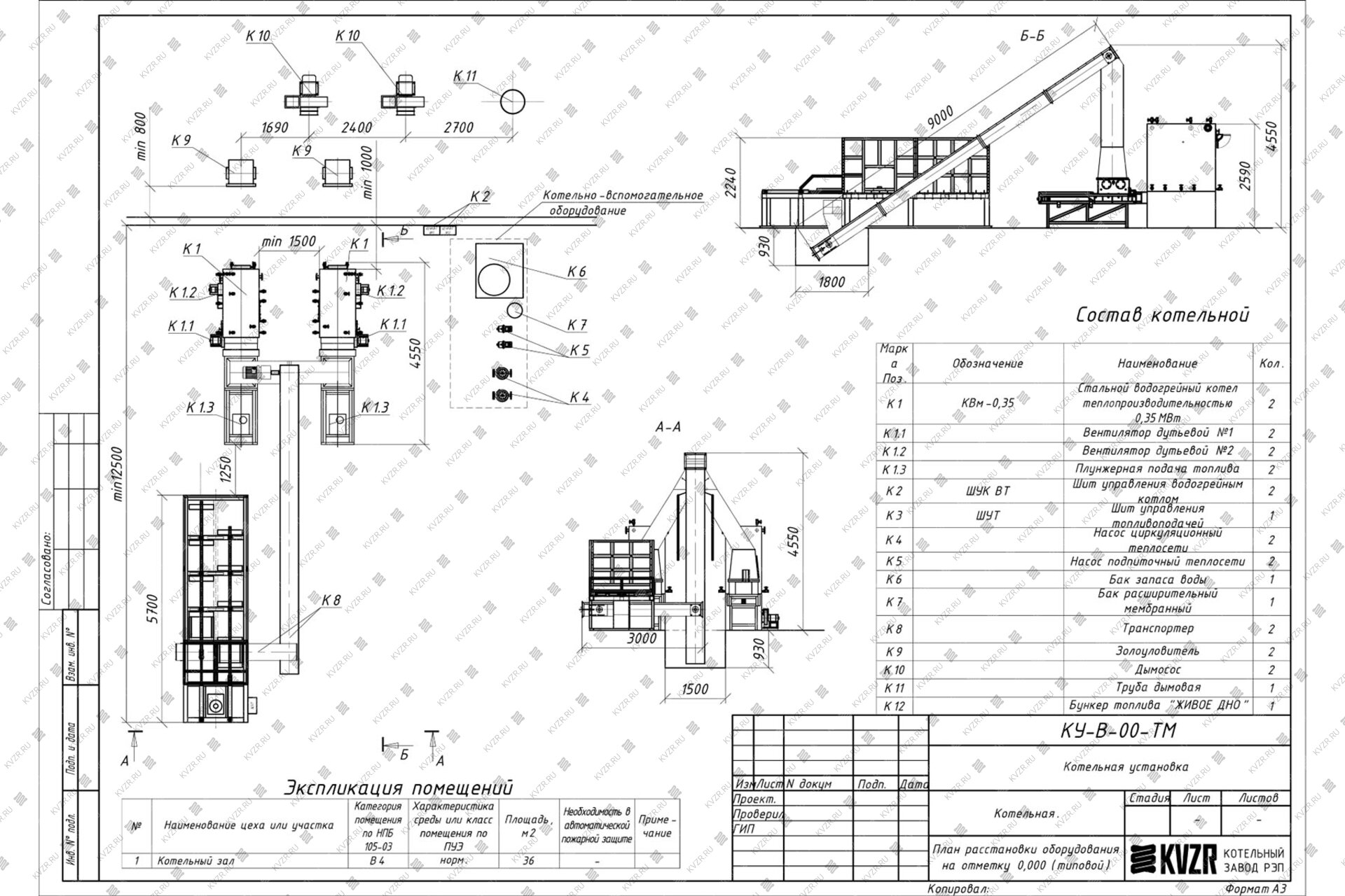 Водогрейный твердотопливный стальной отопительный котел 0.35 МВт на опилках, предназначен для получения горячей воды номинальной температурой на выходе из котла от 95 до 115 °С рабочим давлением до 0,6 (6,0) МПа (кгс/см), используемой в системах централизованного теплоснабжения на нужды отопления, горячего водоснабжения. Устанавливается в производственных, промышленных и отопительных котельных.