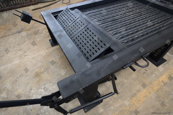 Модель с топкой ОУР. Топка ОУР выполняется из труб по которым движет теплоноситель и межтрубных металлических полос с отверстиями. Теплоноситель - вода, остужает конструкцию изнутри, предотвращая перегрев и програр колосников. Отверстия покрывают всю поверхность колосников для равномерной подачи воздуха в топливный слой. Небольшой размер отверстий не дает провалиться недогоревшему топливу в зольник. Топливо остается в топке до полного выгорания.